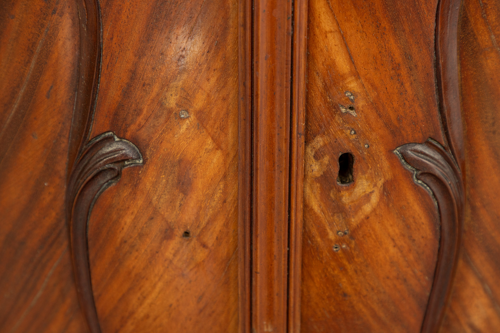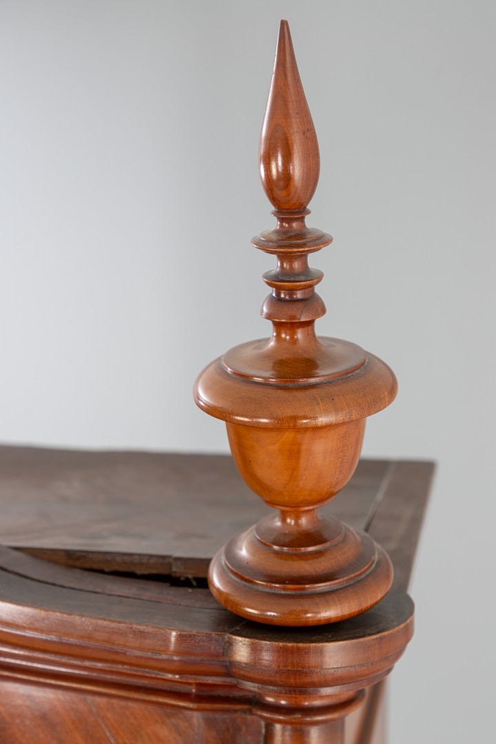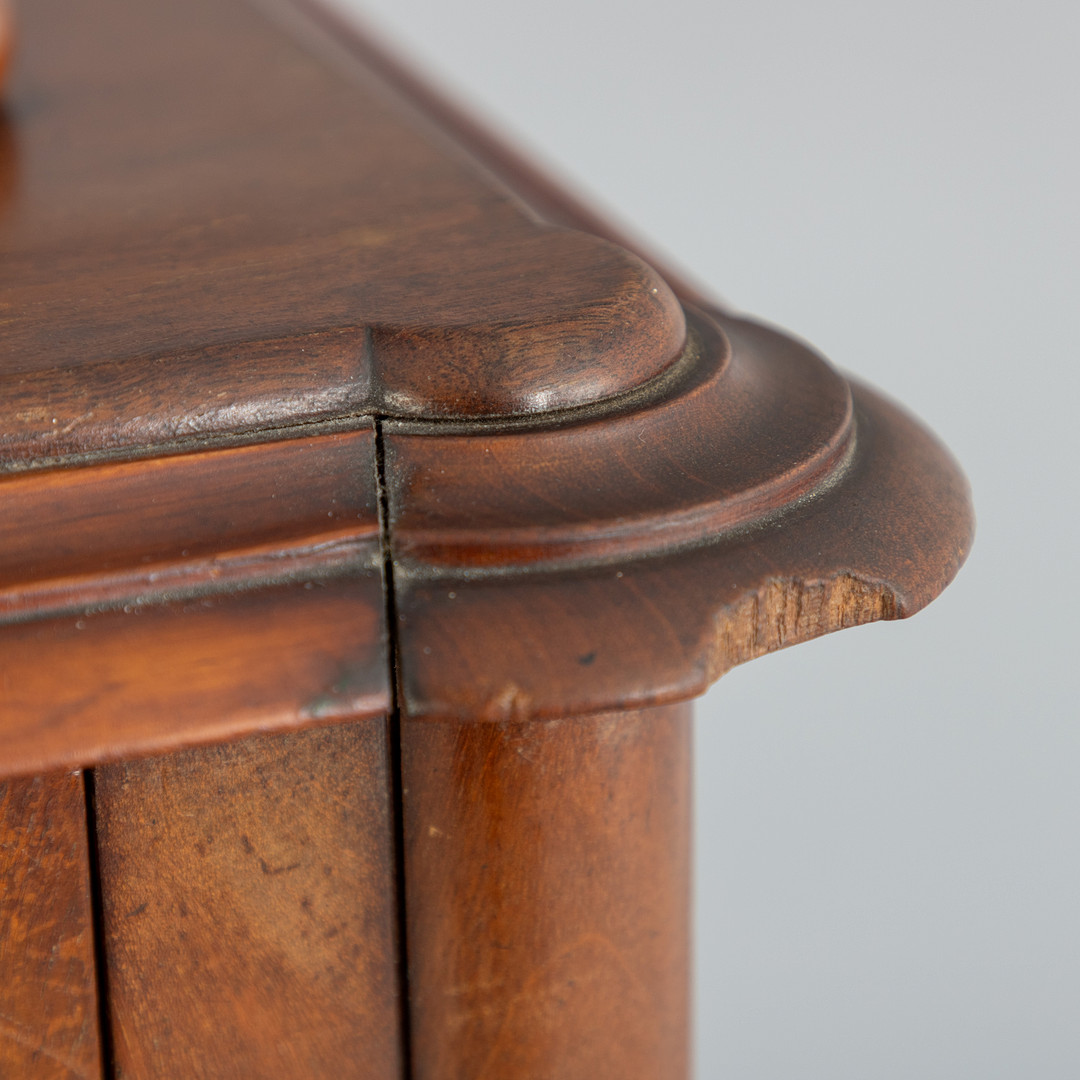 Gebrauchsspuren, stellenweise Bestoßungen und Defekte, Schlüsselbeschläge im Unterteil fehlen.