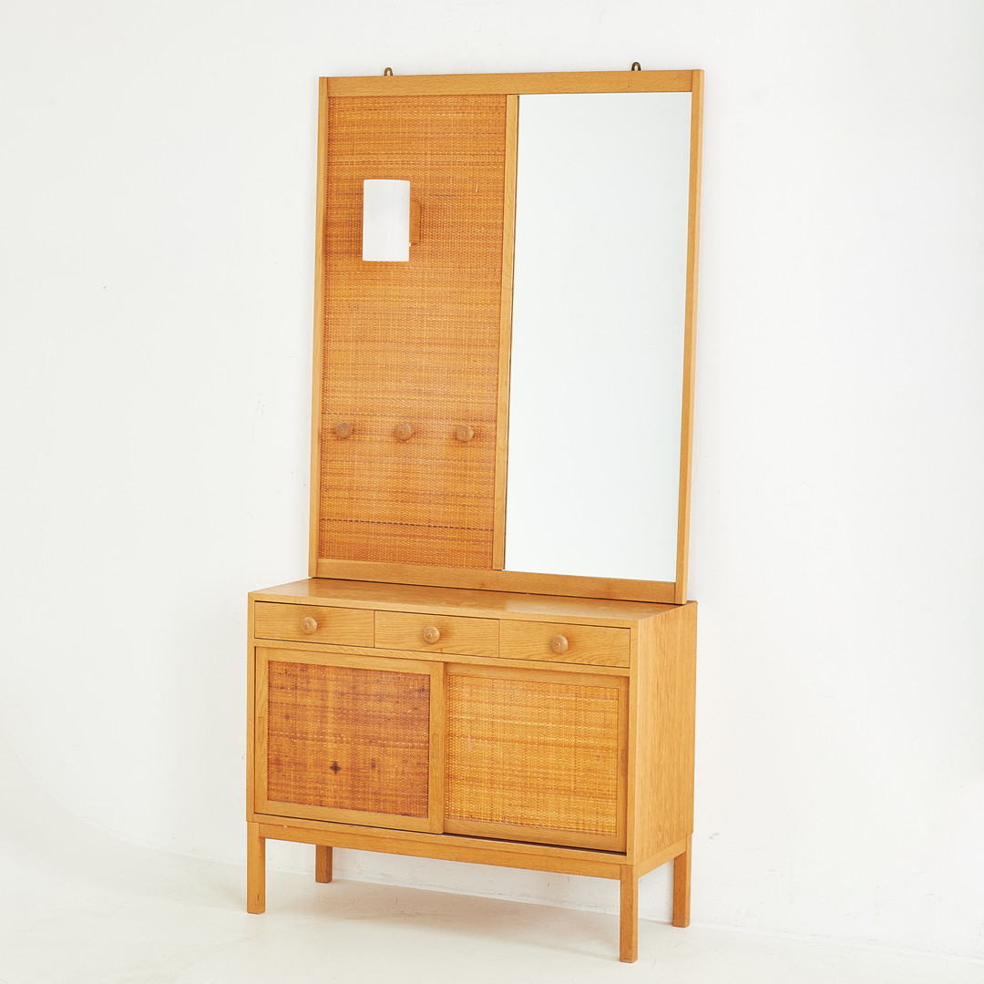 HALLMÖBEL, 2 dlr, "Avanti", Fröseke, spegel och byrå, ek, rotting, skärm i akrylplast, skåp med tre draglådor, invändigt med ett hyllplan.