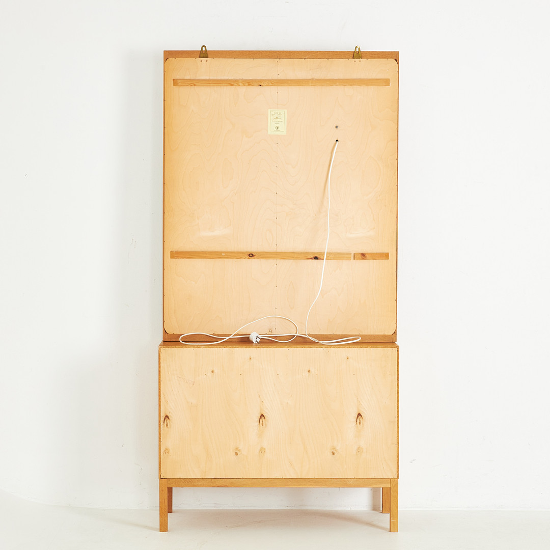 Saknas en hyllbärare för hyllplan, bruksslitage, rotting med fläck, belysning fungerade vid katalogiseringstillfället, ingen funktionsgaranti lämnas.