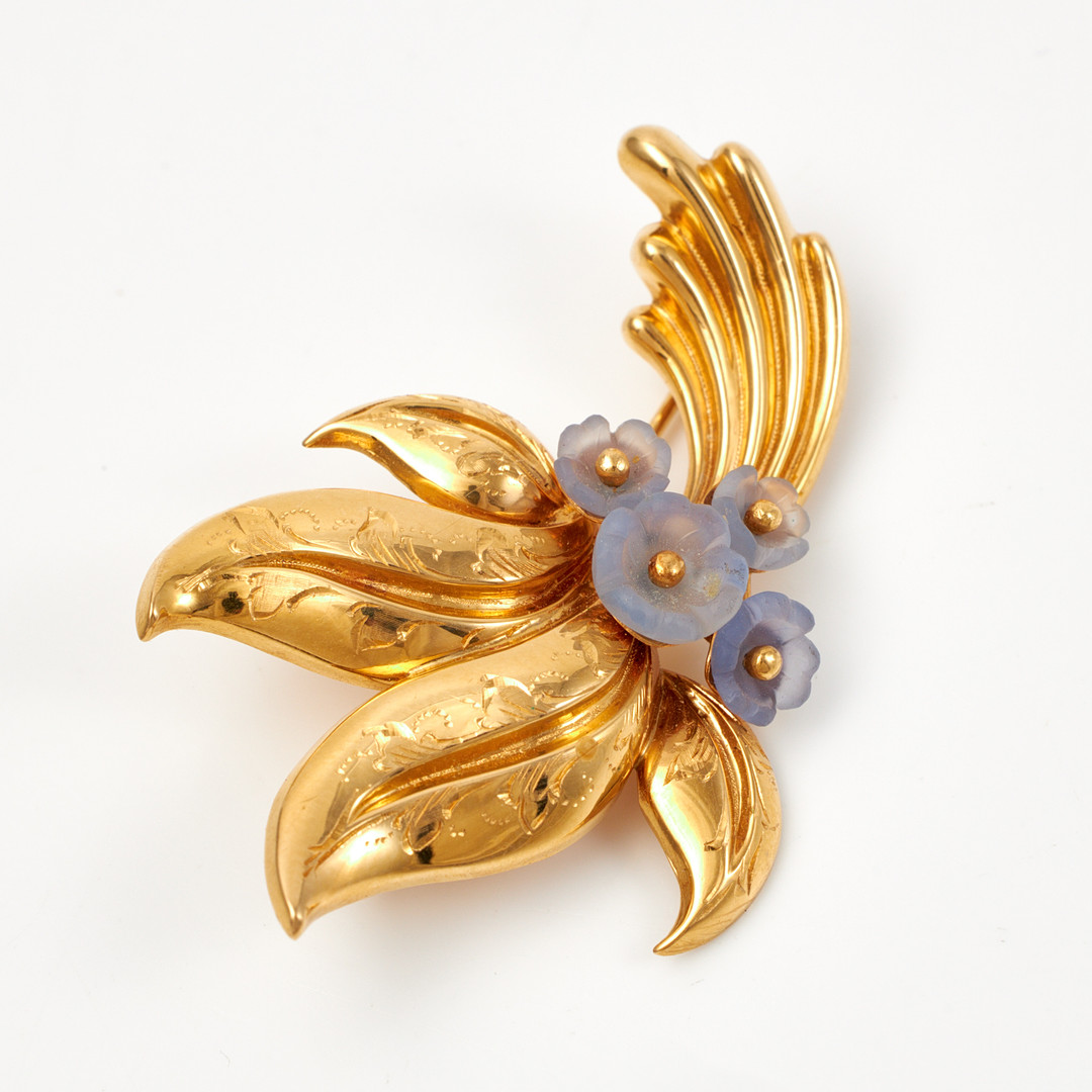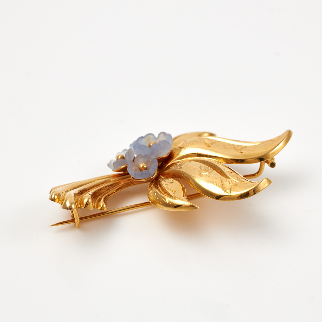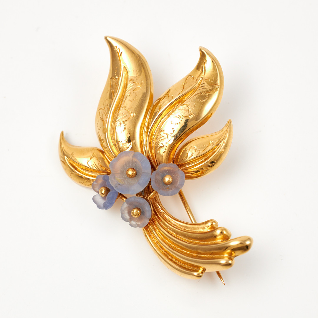 BROSCH, 18 k guld, i form av löv med slipade blå ädelstenar i from av blommor, Guldvaruaktiebolaget G. Dahlgren & Co Ab, Mlamö, 1929.