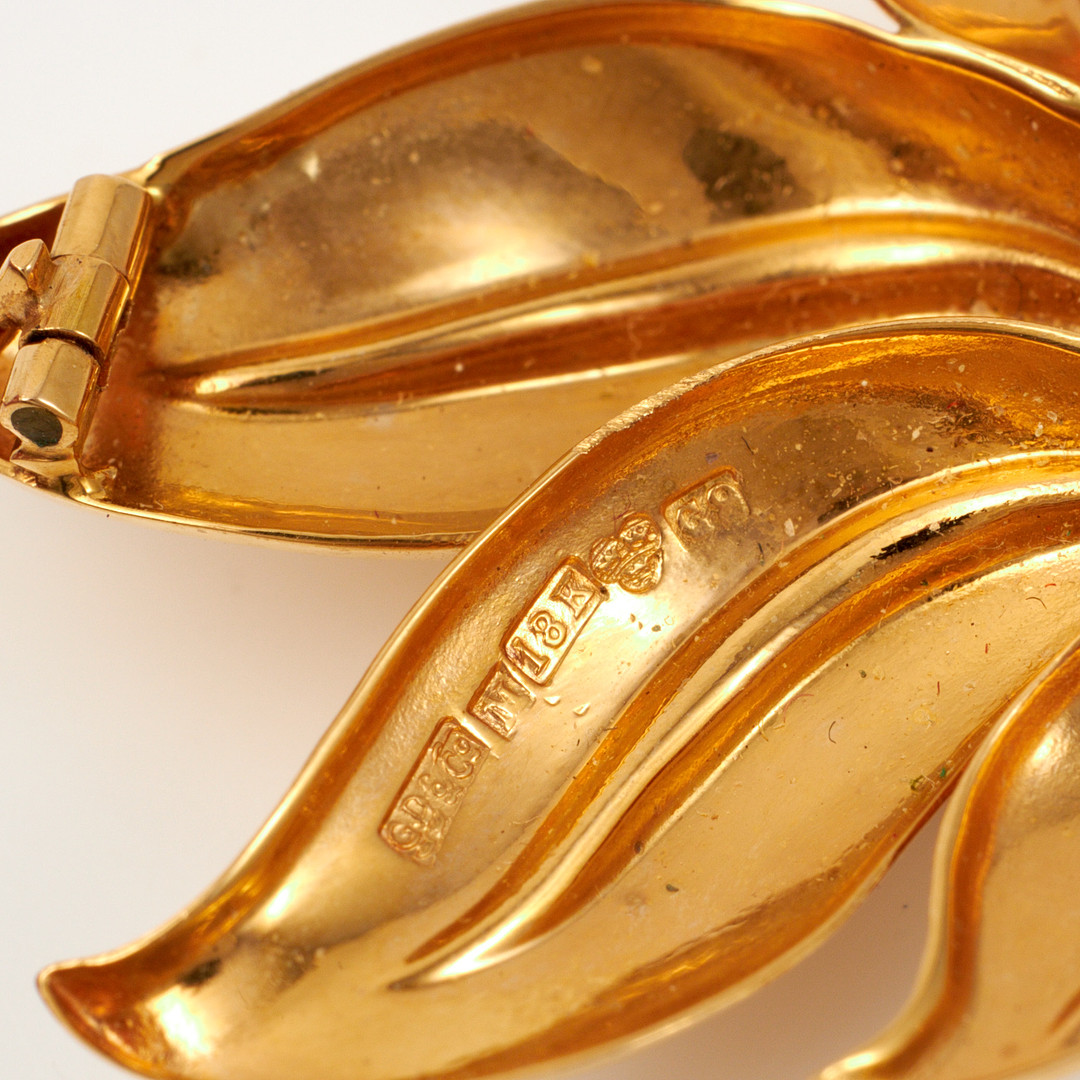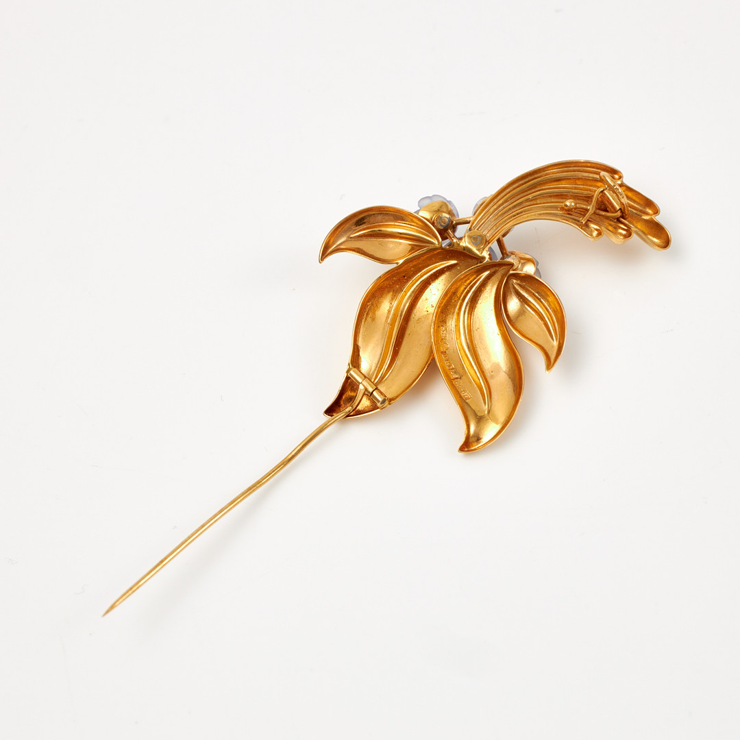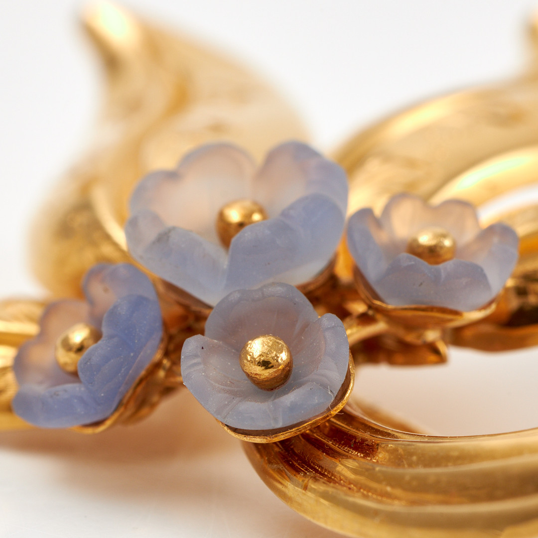 BROSCH, 18 k guld, i form av löv med slipade blå ädelstenar i from av blommor, Guldvaruaktiebolaget G. Dahlgren & Co Ab, Mlamö, 1929.
