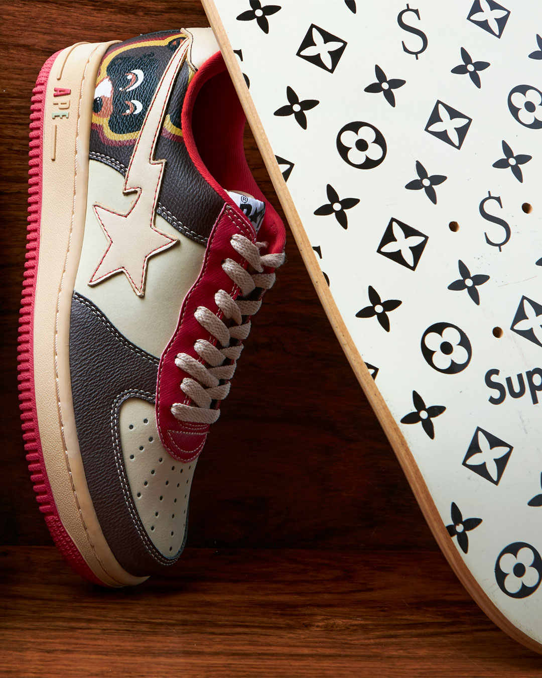 Further pieces from Ye’s early design work appear in his collaboration with the sneaker brand Bape Sta. The rapper’s first design partnership resulted in a pair of shoes with a retro sensibility, echoing the aesthetic of his 2004 album The College Dropout. The shoes are adorned with the mascot from his early musical career — the Dropout Bear.