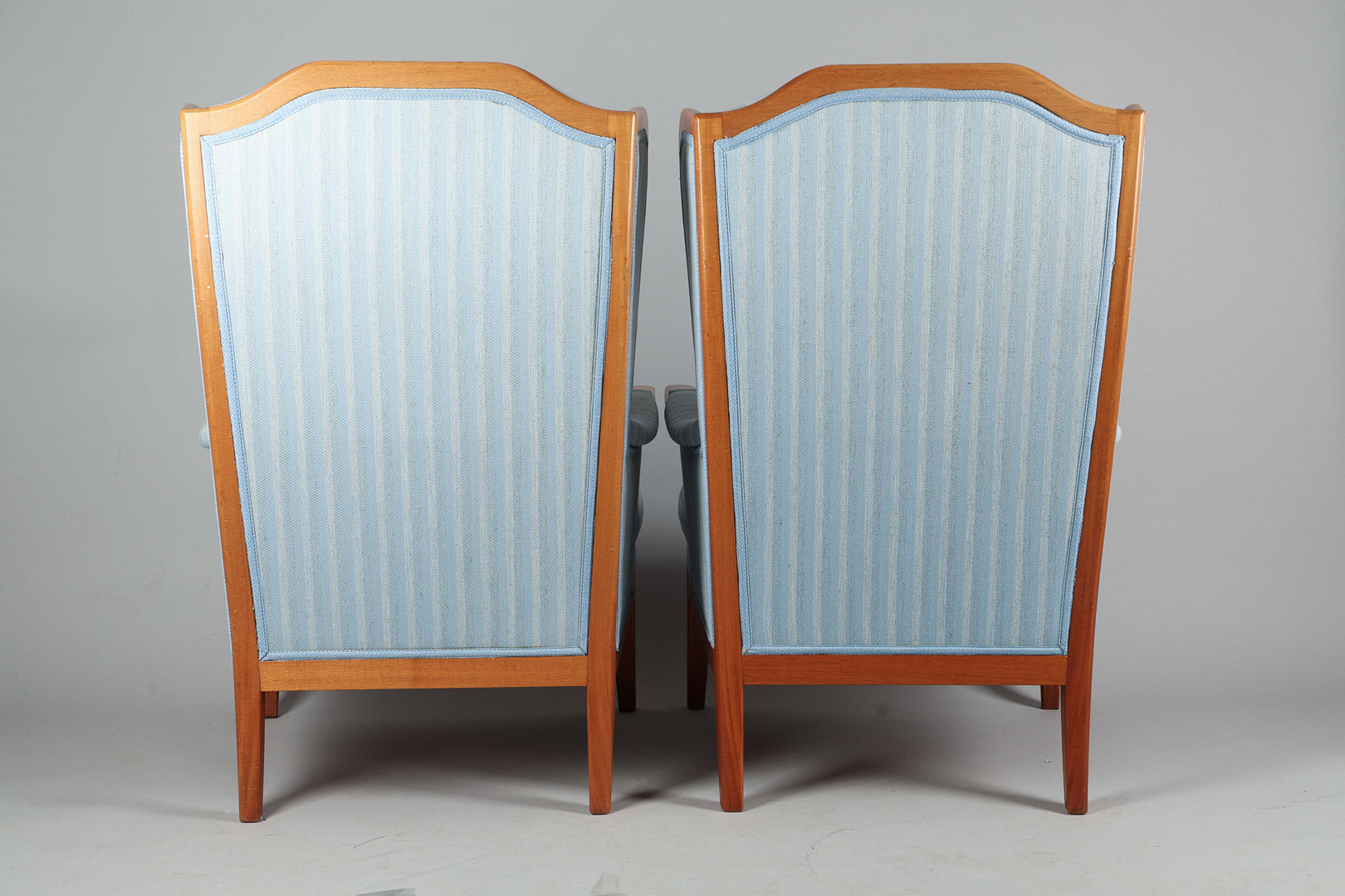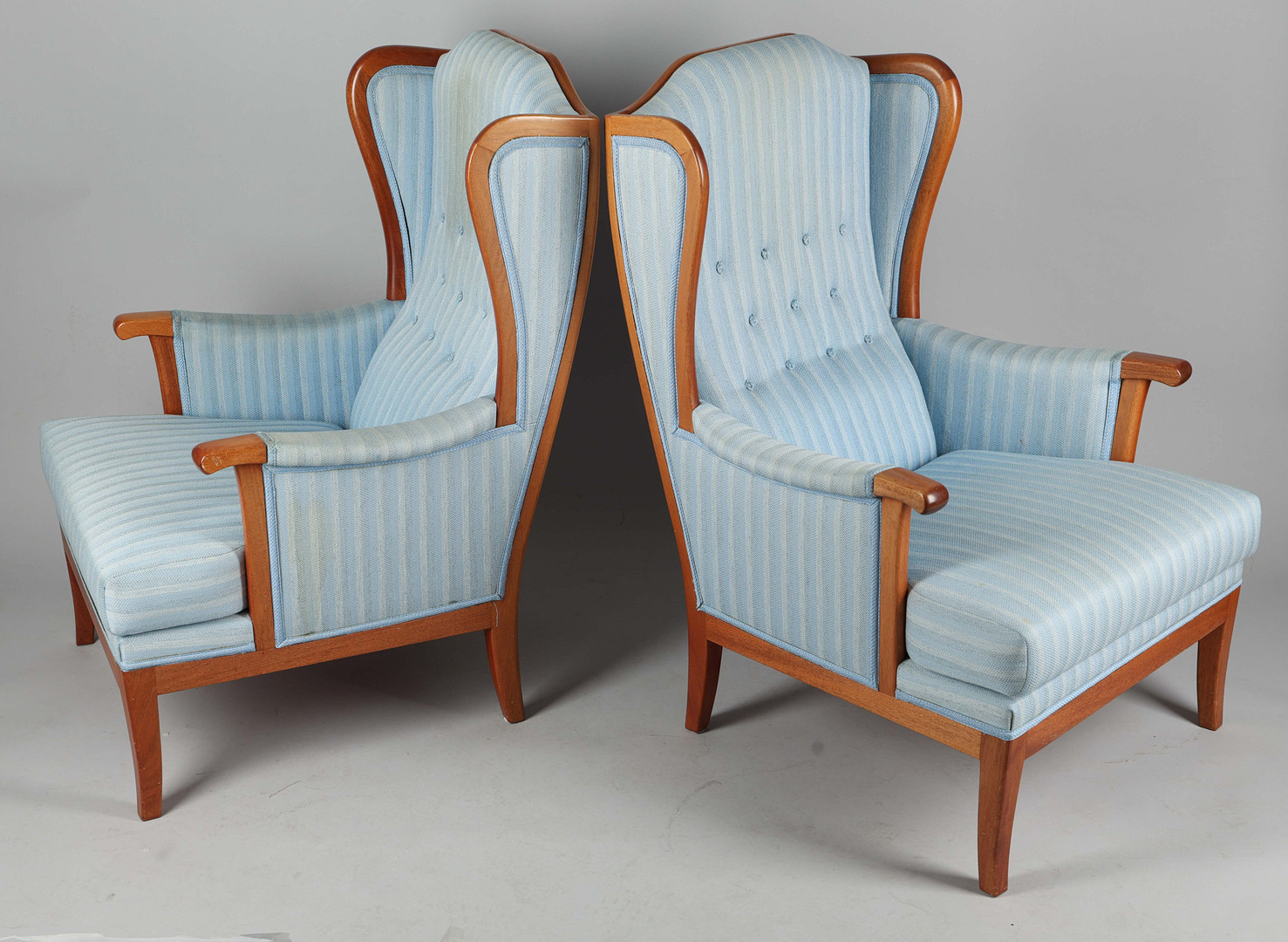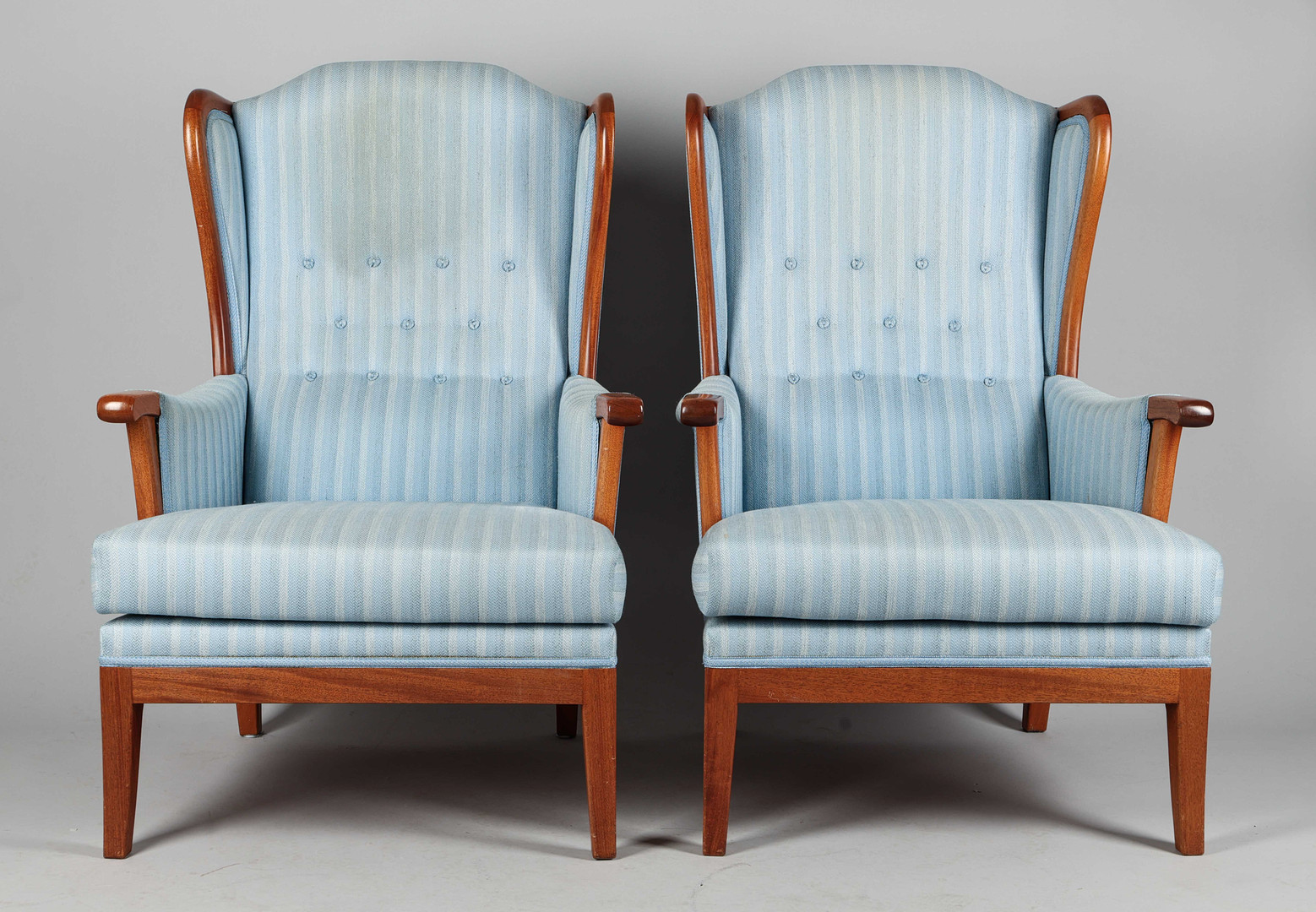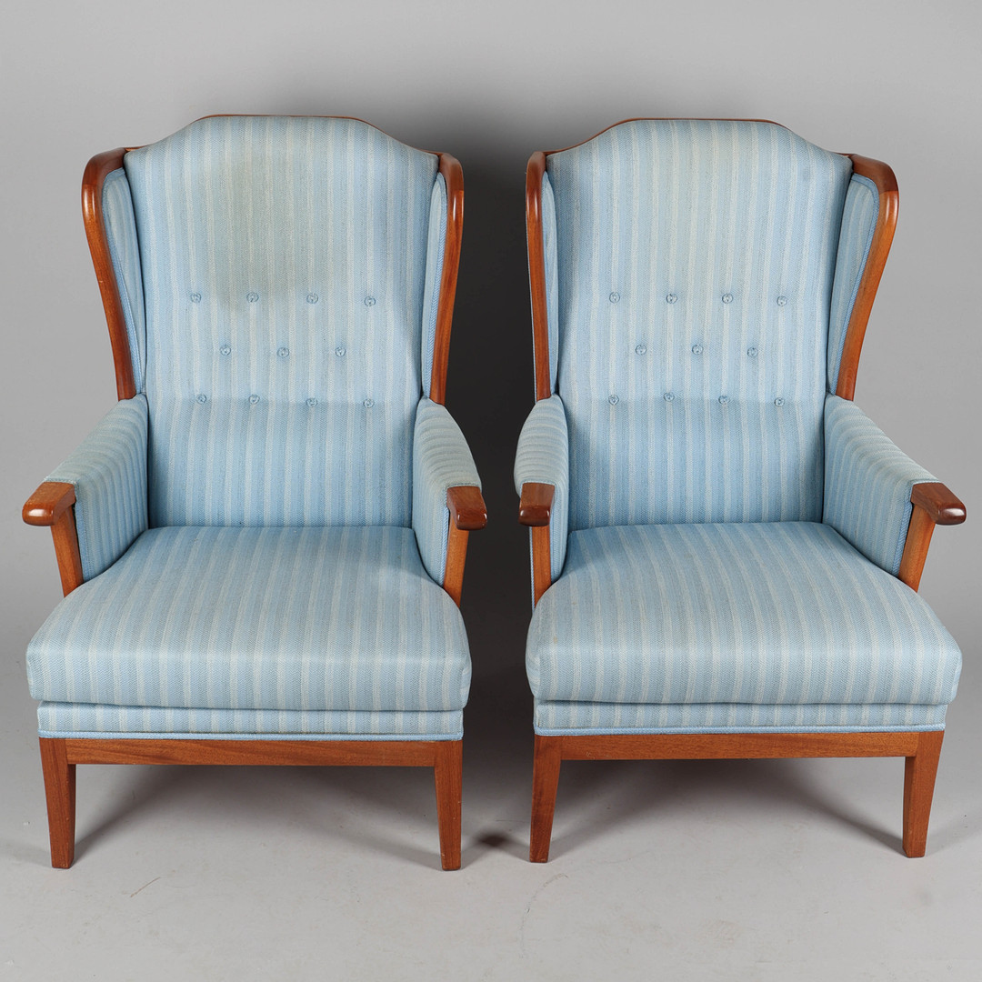 CARL MALMSTEN. 1 par fåtöljer, "Husfadern", OH Sjögren, mahogny, textilklädsel.