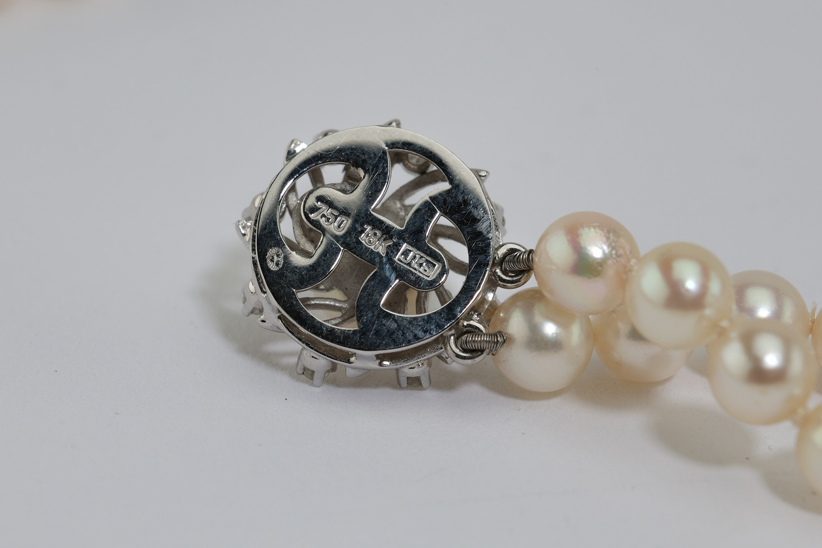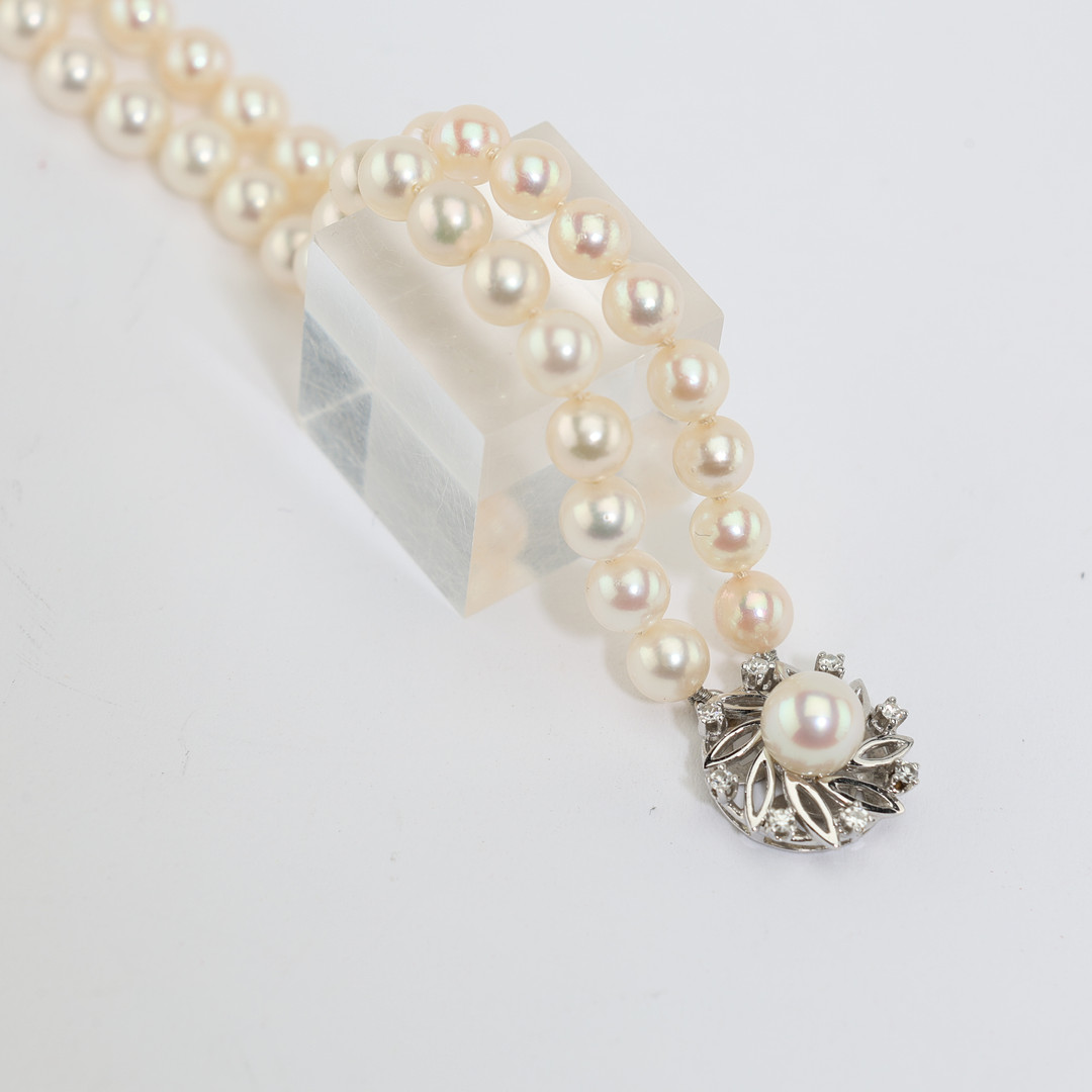 COLLIER, Dubbelradigt pärlhalsband med lås i 18k vitguld med pärla och vita stenar. JKa.