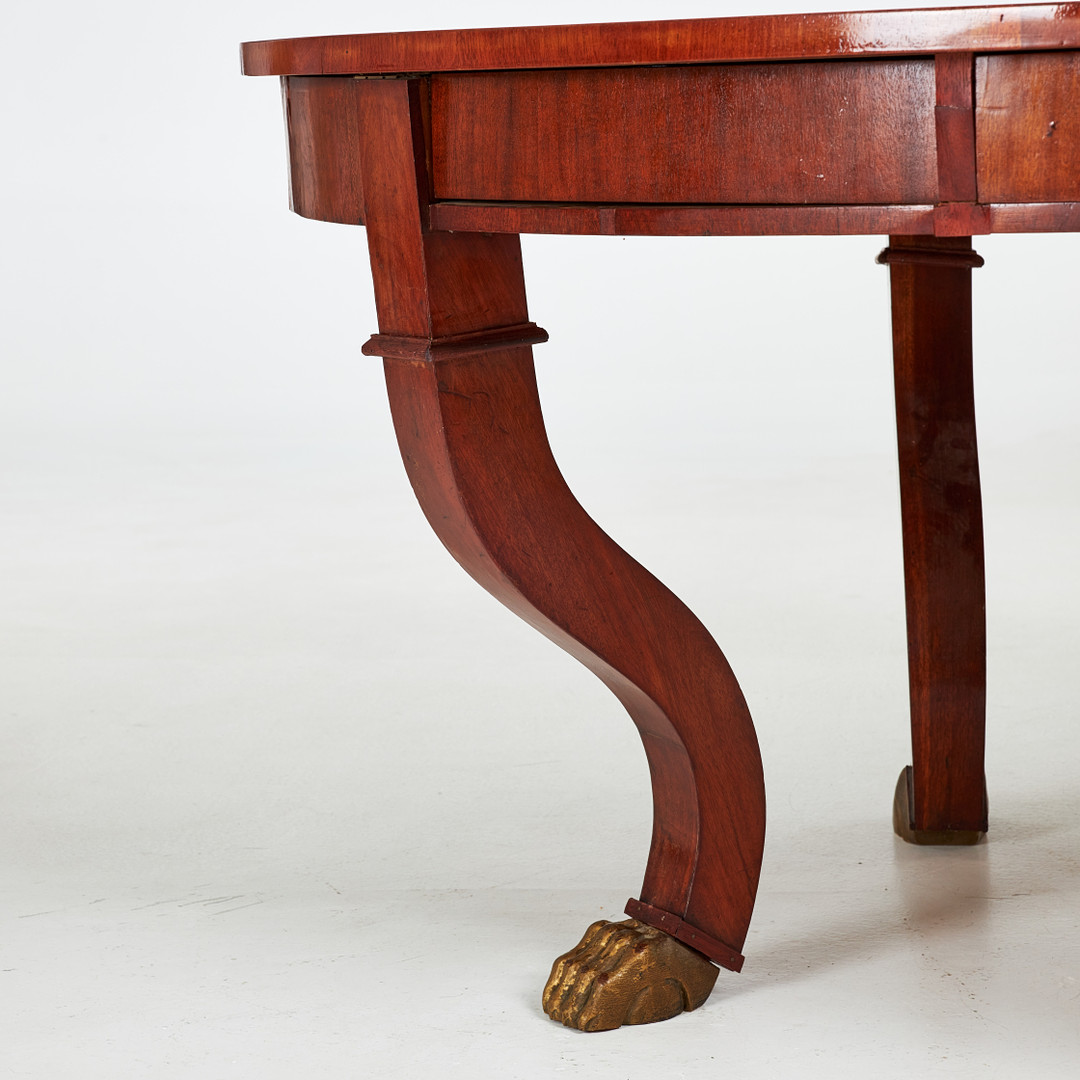 SALONGSBORD. Empire, 1800-talets första hälft, oval skiva, mahogny, lådor i sarg, svängda ben med lejontassar.
