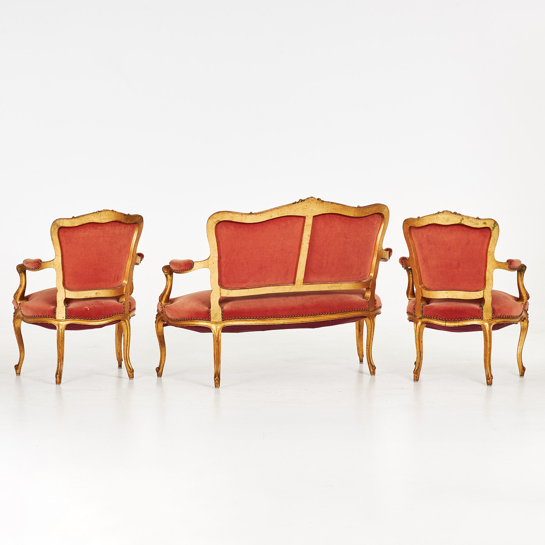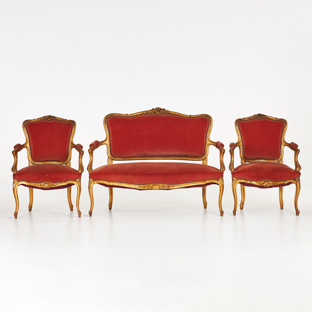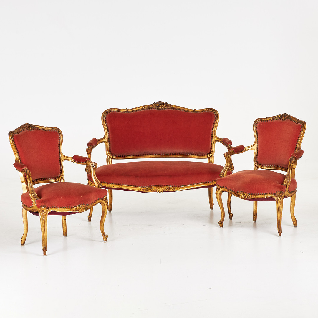 SALONGSGRUPP, Soffa samt karmstolar, 3 dlr, Louis XV-stil, rosa plyschklädsel, Frankrike, 18001900-tal.