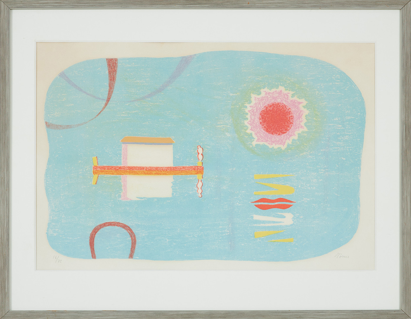 STELLAN MÖRNER. Komposition med brygga samt sol, färglitografi, numrerad 16/75, signerad Mörner.