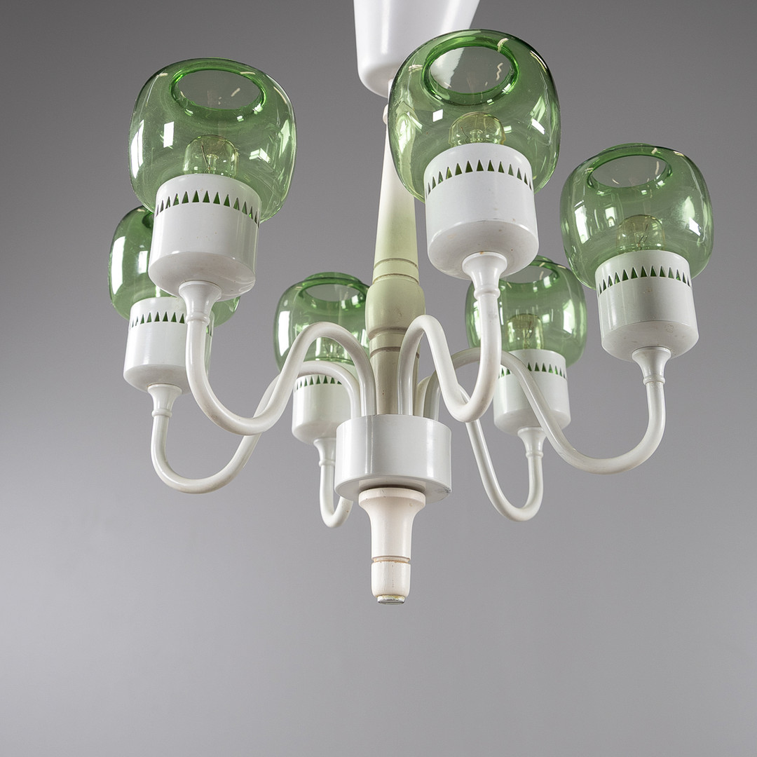 HANS AGNE JAKOBSSON. Taklampa, vitlackad med gröna glaskupor, Markaryd, 1900-talets andra hälft.