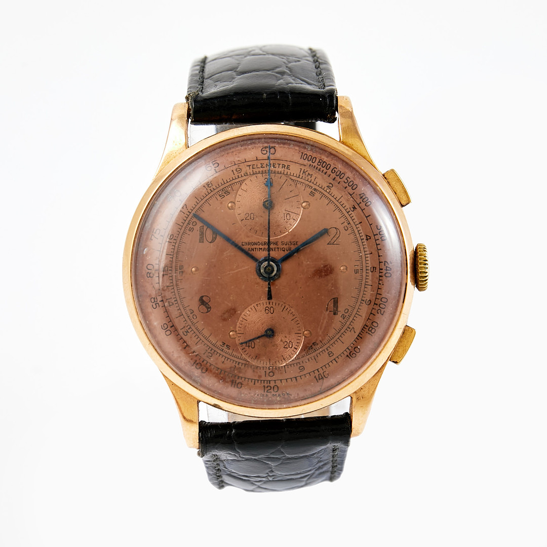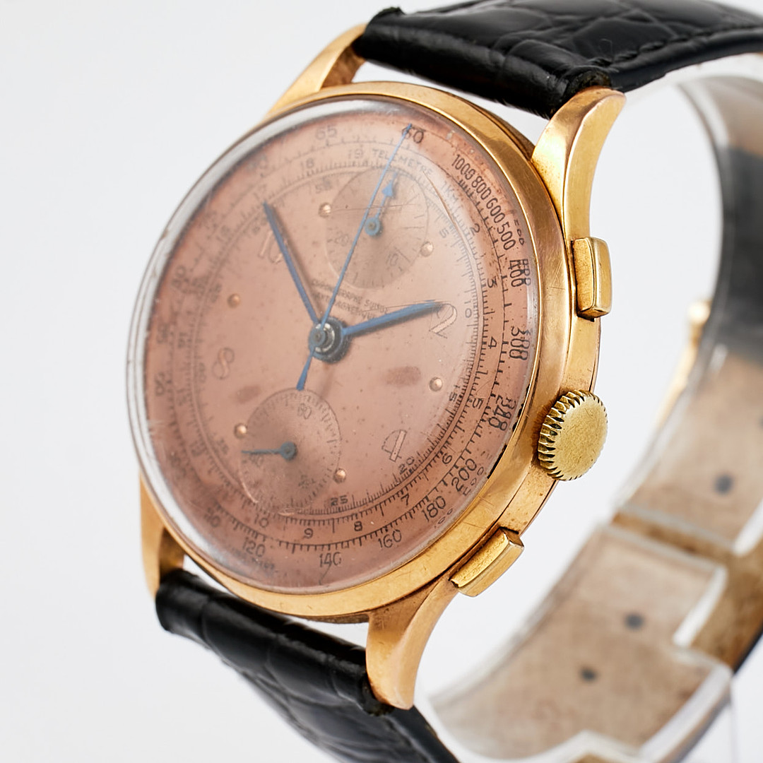 ARMBANDSUR, kronograf, telemetre, cal Venus 170, boett i 18 k guld, inreboett i metall, manuell, plexiglas, diameter 35 mm, ca 1940-tal.