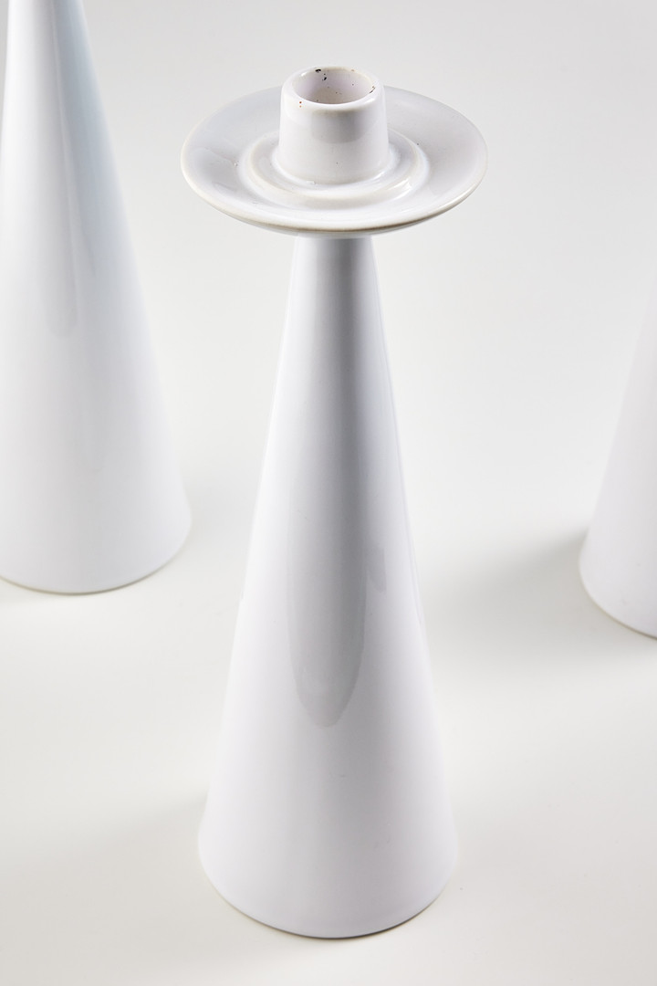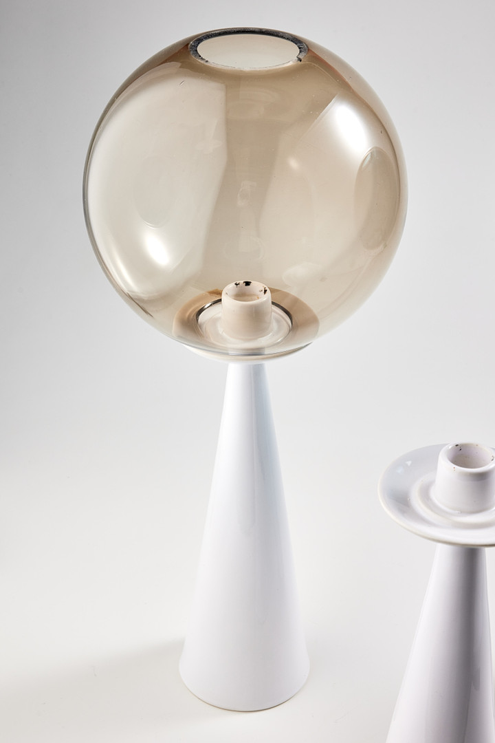 HANS-AGNE JAKOBSSON. Ljuslyktor, tre stycken, modell L7, vitglaserat porslin med kupor i blått och brunt glas.