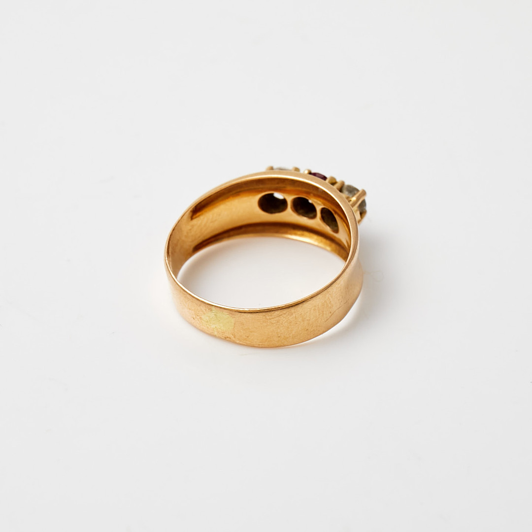 RING, 18 k guld, med röd ädelsten, flankerad av två vita ädelstenar, otydliga stämplar.