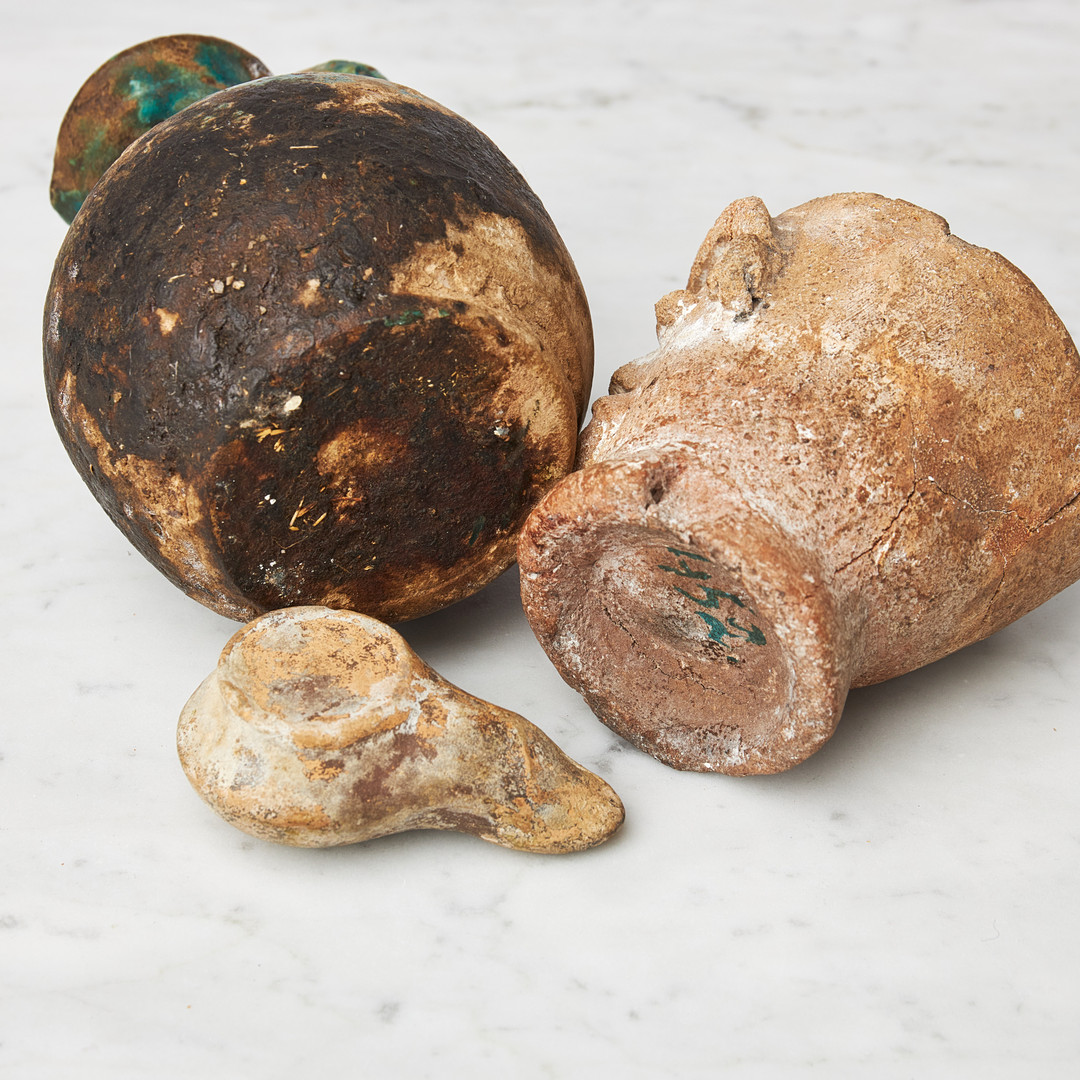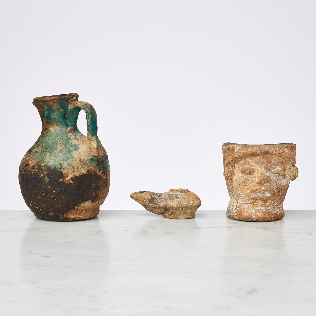 KÄRL samt OLJELAMPA, 3 dlr , oljelampan hellenistisk ca 200-100 f Kr, kanna islamskt kulturområde möjligen medeltid. antropomorft kärl möjligen Nordafrika, den senare med äldre inventarienummer.