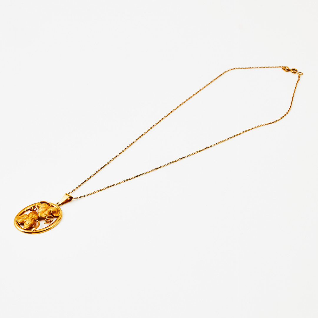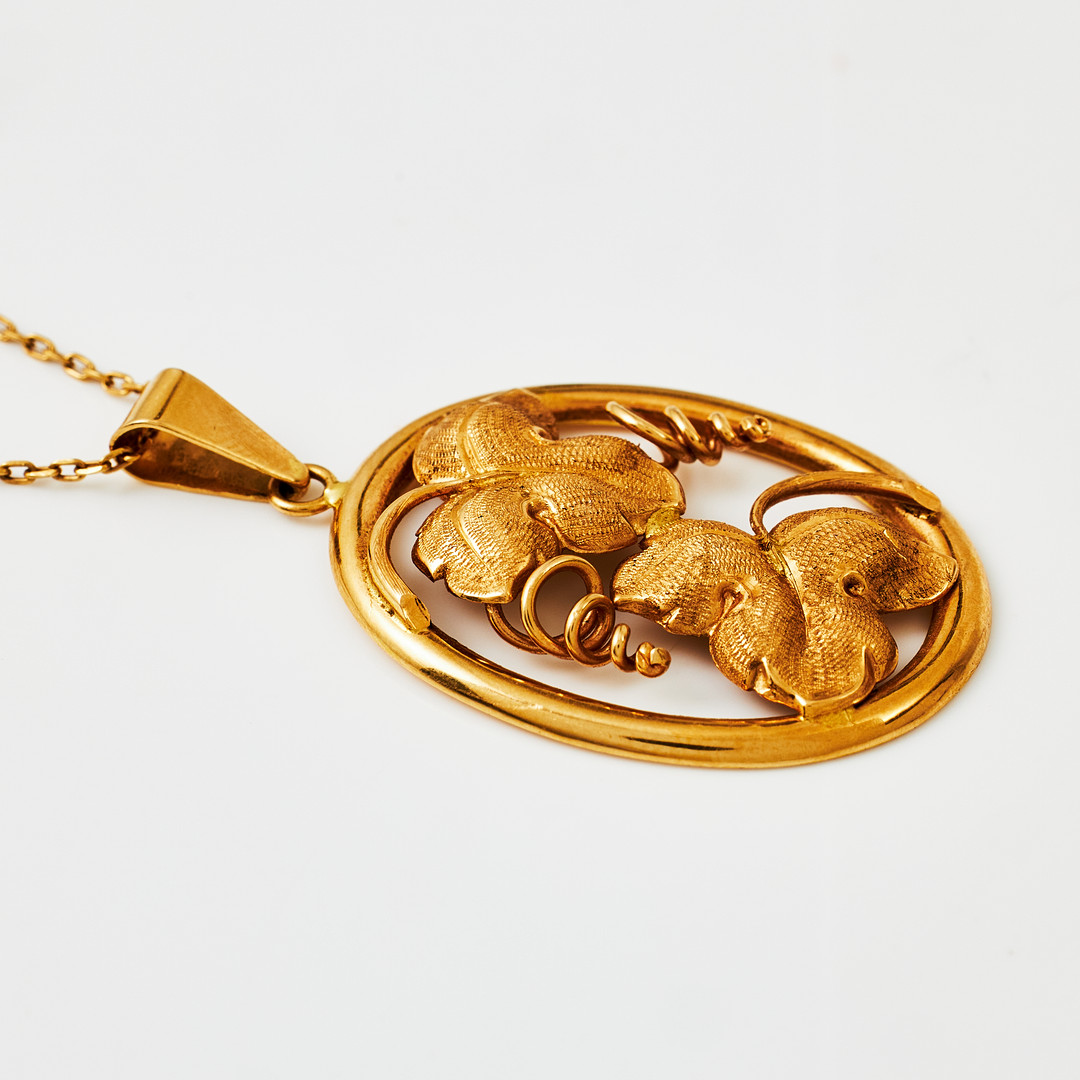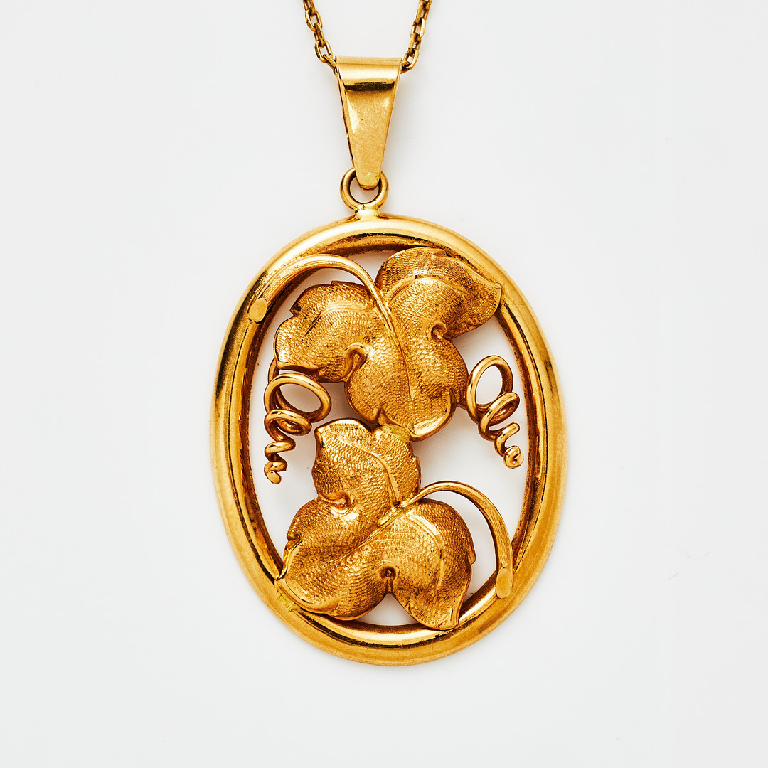 HALSKEDJA MED HÄNGE, 18 k guld, hänget med dekor av vinblad, stämplad K&EC, Göteborg, årsindex saknas.