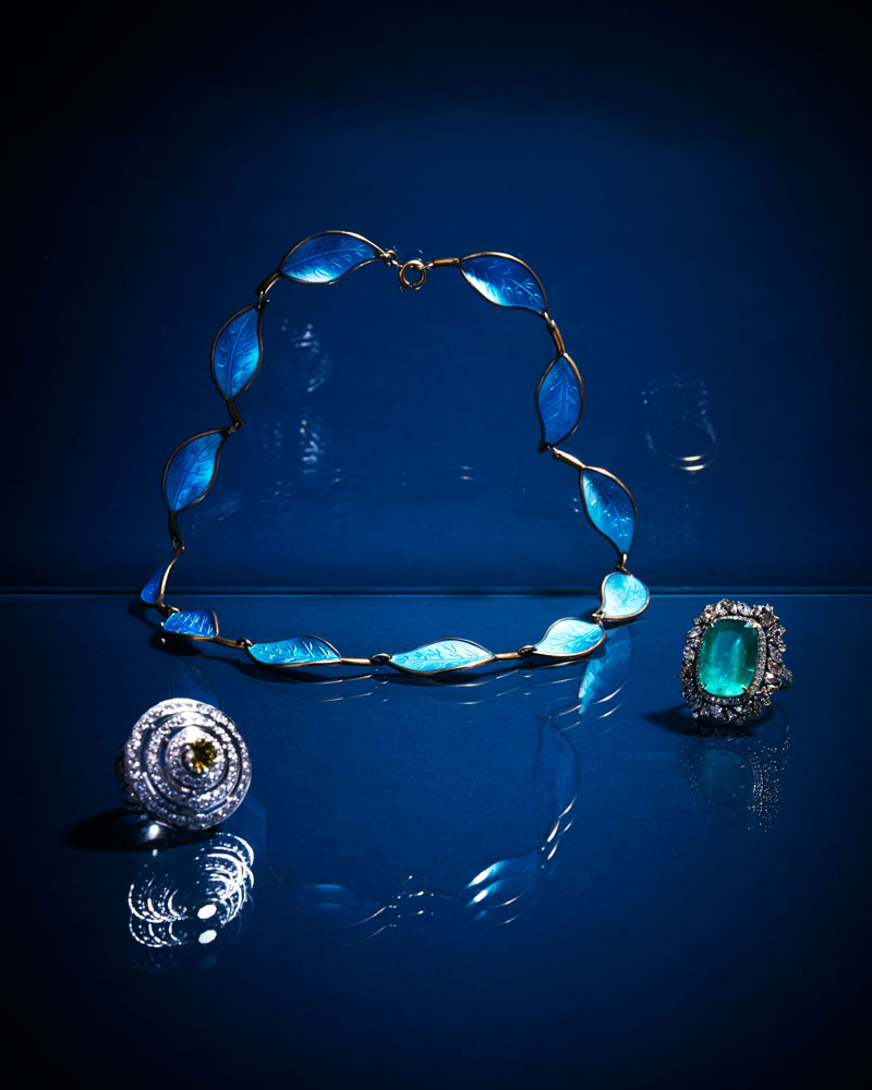 Dessa tre exempel samsas om utrymmet tillsammans med collier, broscher, caméer, ringar och manschettknappar av idel ädelmetaller. En ring i 18 K vitguld med en stor fantasislipad safir drar ögonen till sig och detsamma kan sägas om det franska lilla etuiet, tillkommet i en av stilhistoriens mest dekorativa epoker.