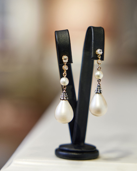 Örhängena i 18 karat guld pryds av droppformade naturliga pärlor med utsökta pärlhattar och infattningar av antik- och rosenslipade diamanter. Från ett utrop på 200 000–300 000 kronor steg budgivningen snabbt och resulterade i ett slutpris som blev en av auktionens största höjdpunkter.