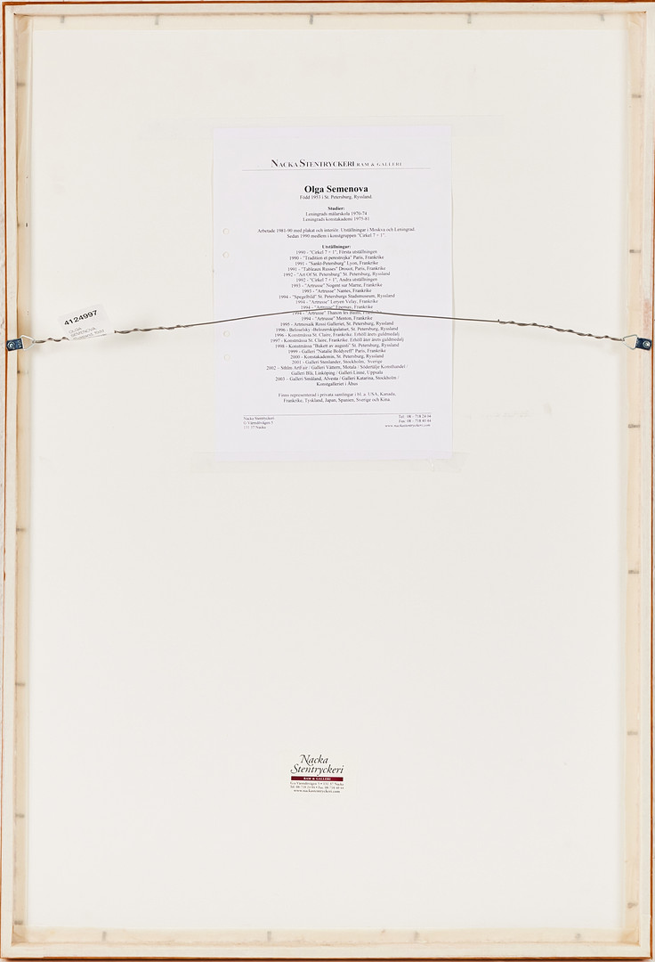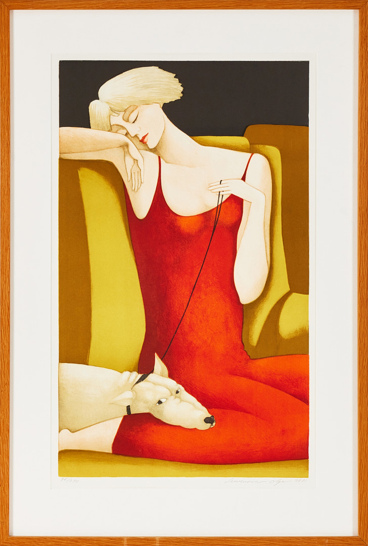OLGA SEMENOVA. (Ryssland, född 1953). Sovande kvinna med hund, färglitografi, signerad och daterad Semenova Olga 2001, numrerad 96/290.
