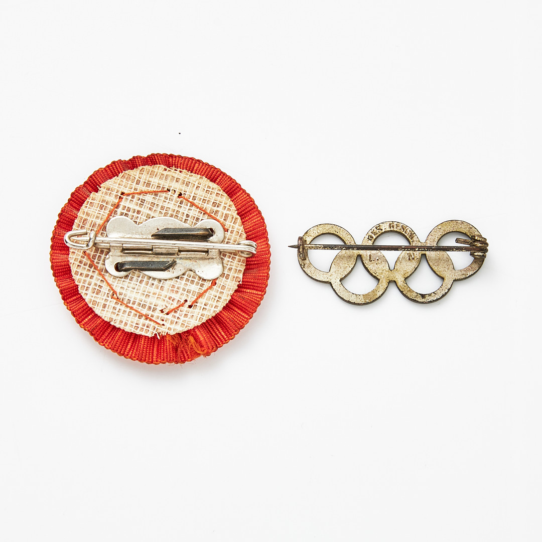 MÄRKEN, 2 st, OS Berlin 1936 Gymnastik, Sportauktion samt märke med OS-ringar.