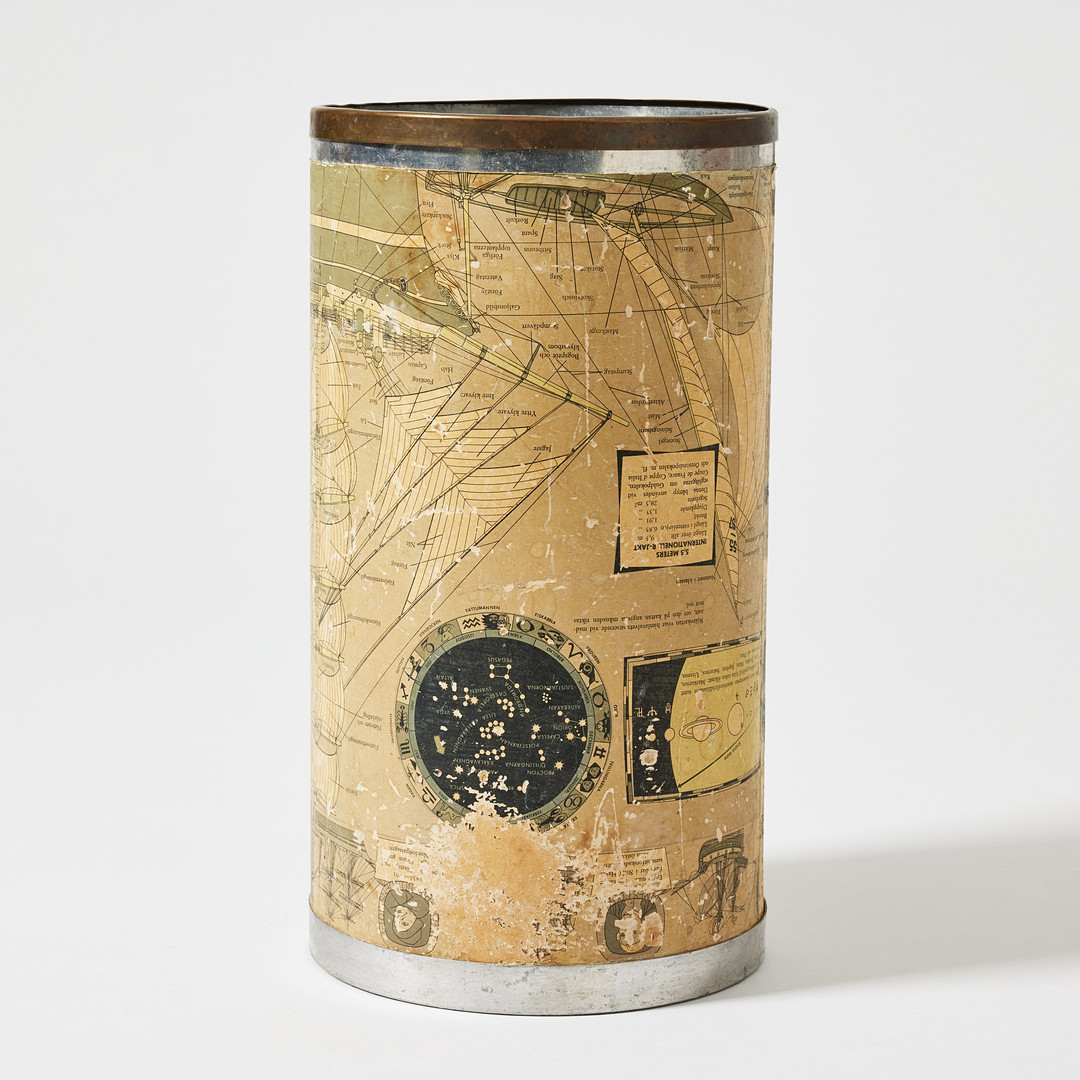 FIRMA SVENSKT TENN. Papperskorg, Stockholm, sannolikt 1960-tal, plåt och mässing, tapetserad med Nautisk Bibliotekskarta.