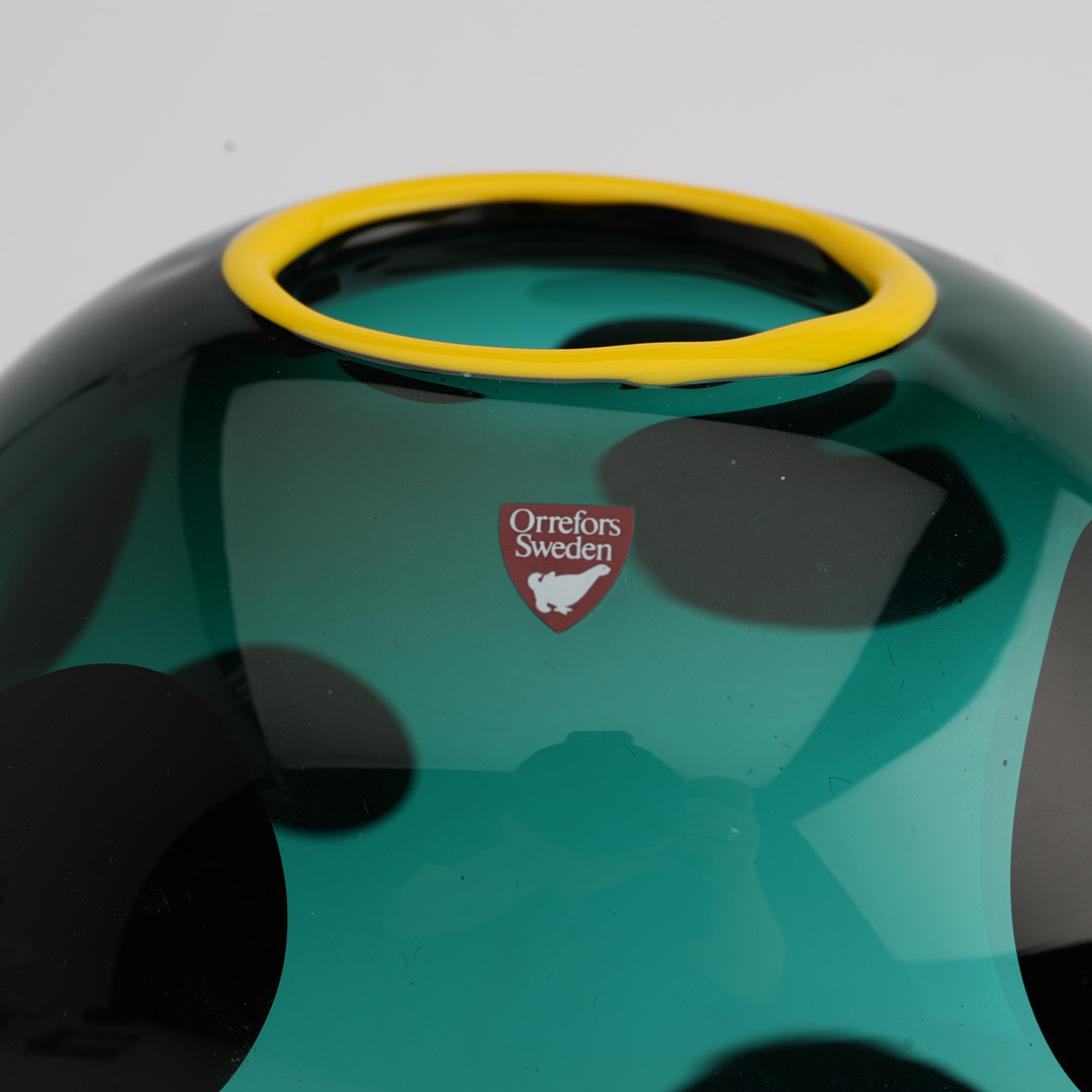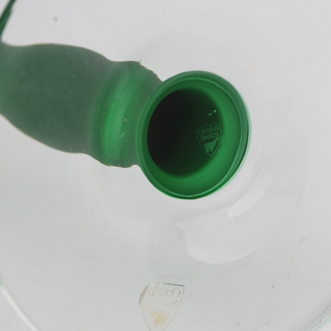 ANNE NILSSON. Vas, grön med prickar + grön ljusstake "Celeste", Orrefors.