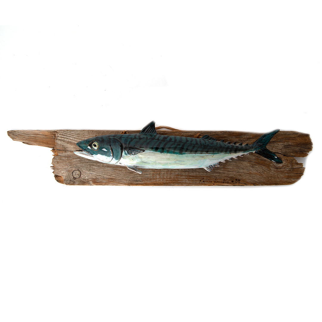 KARIN KYRLIN, figurin, fisk, keramik monterad på trä, signerad och daterad -84.